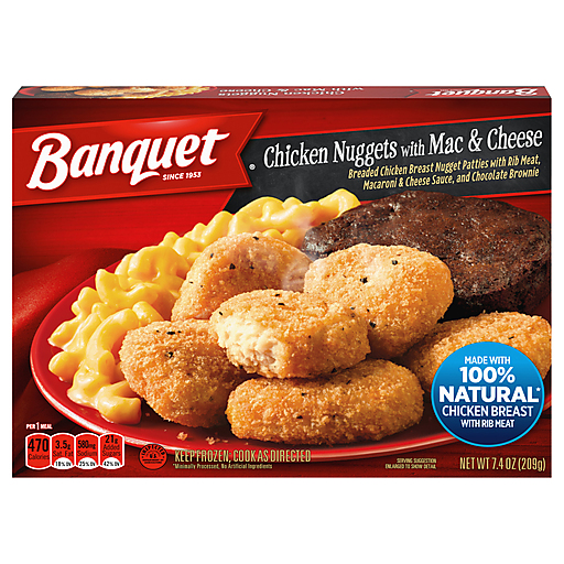 Banquet Chicken Nuggets with Mac and Cheese and Brownie frozen meal brings a classic to your table in minutes. This frozen dinner features breaded white meat chicken nugget patties, macaroni and cheese and a chocolate brownie for a delicious frozen meal. Chicken nugget ready made meals make hearty frozen dinners on busy nights and excellent frozen lunches at the office. To prepare frozen meals, simply follow the instructions on the package to prepare frozen dinners in the oven for fresh-baked taste, or in the microwave for quick, prepared meals. Store the 7.4 ounce chicken nuggets frozen entrees in the freezer until you’re ready to enjoy. in the U.S.A. for over 60 years, Banquet has been making delicious food the whole family loves.